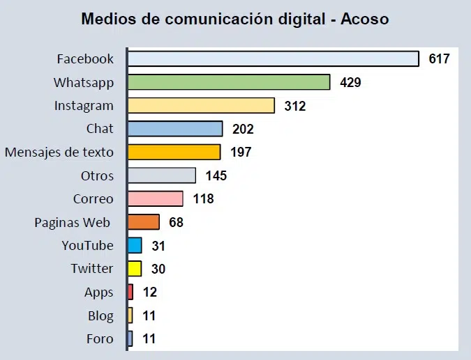 La plataforma más usada para cometer actos de acoso se repite nuevamente este año: Facebook. En lo que va de este año, 617 casos se perpetraron a través de esa red social.